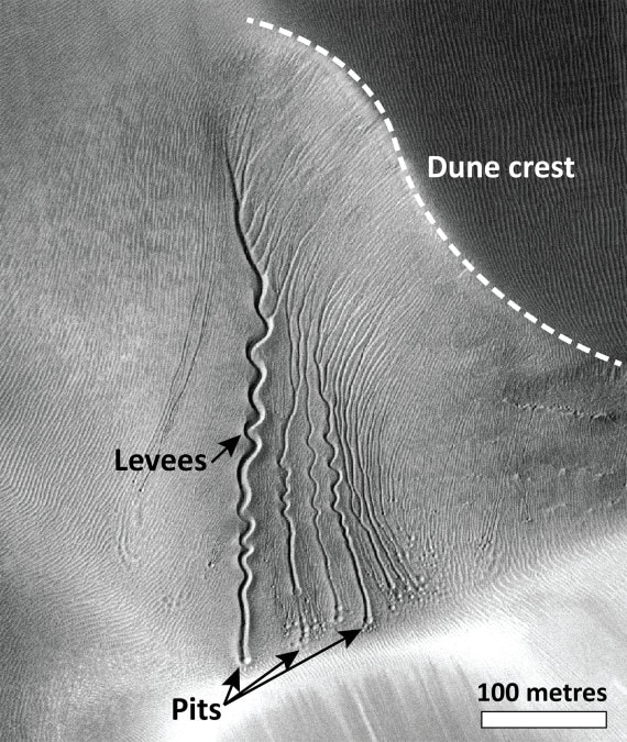En ces dernières années, des scientifiques ont avancé plusieurs hypothèses pour expliquer l’origine des « goulets » sur Mars — des structures qui traversent les dunes et les pentes de certains cratères martiens — cherchant à comprendre s’ils avaient été façonnés par de l’eau liquide, de la glace, du dioxyde de carbone ou par des processus combinés. Désormais une nouvelle hypothèse suggère que des blocs de glace de CO₂ pourraient être les principaux responsables de la formation de ces canaux et non l’action de l’eau liquide, comme l’ont avancé d’autres chercheurs. L’une des chercheuses qui a contribué de manière déterminante à cette découverte est la docteure Lonneke Roelofs, géologue planétaire à l’Université d’Utrecht (Pays-Bas).